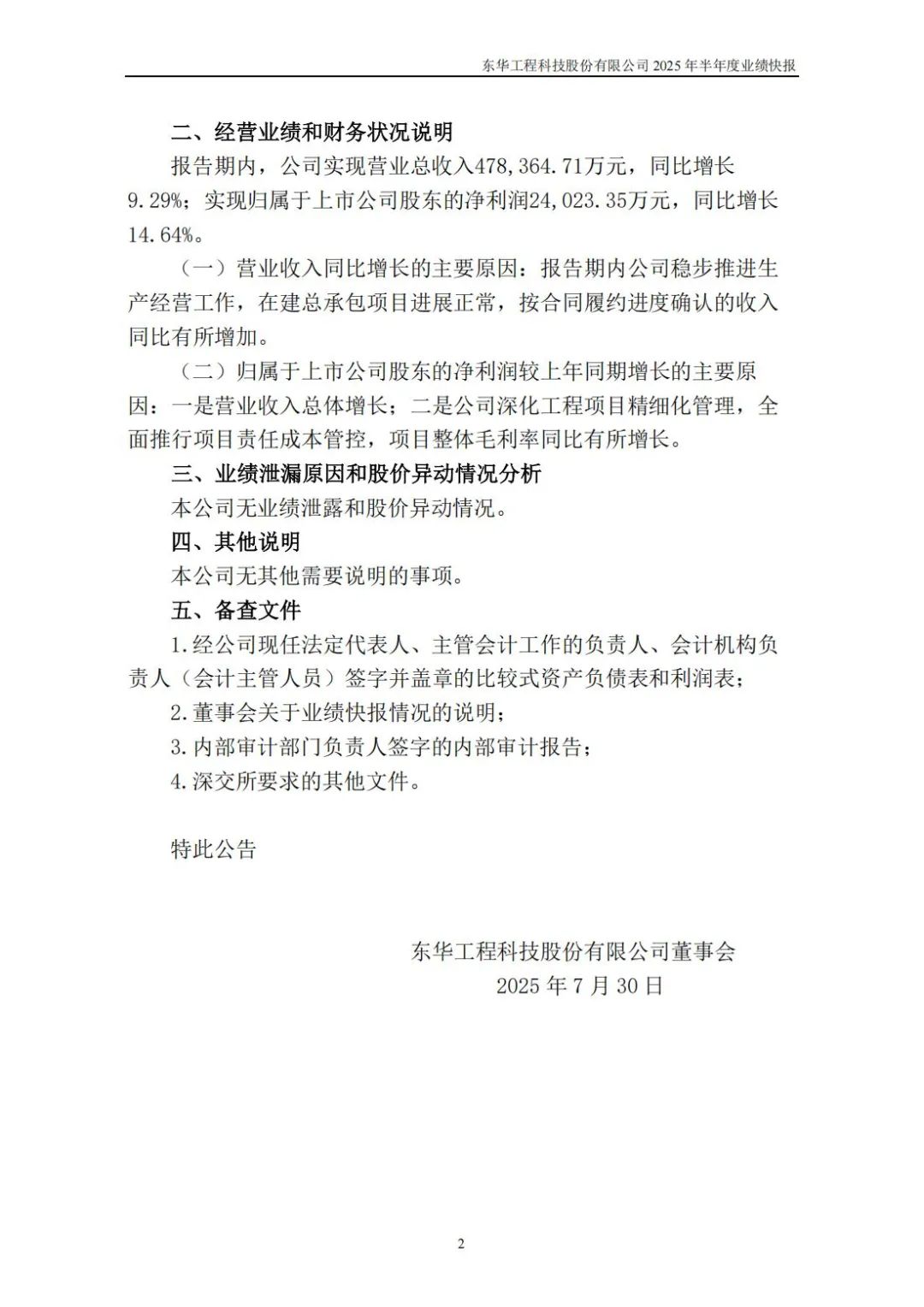 7月30日,東華工程科技股份有限公司(簡(jiǎn)稱:東華科技)發(fā)布2025年半年度業(yè)績(jī)快報(bào)。