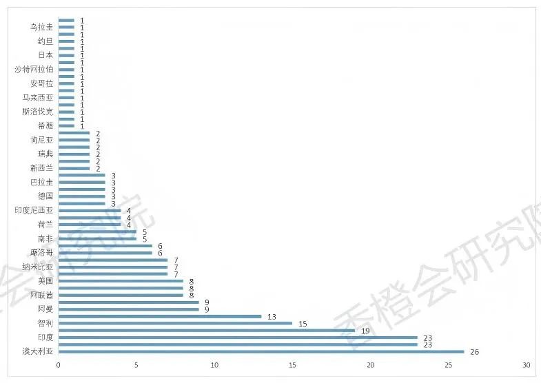 海外規(guī)劃綠色合成氨項目數(shù)量約200個,合計規(guī)劃產(chǎn)能規(guī)模達到約2172萬噸。項目主要集中在澳大利亞、西班牙、印度、埃及和智利5個國家,數(shù)量依次為26個、23個、23個、19個、15個。