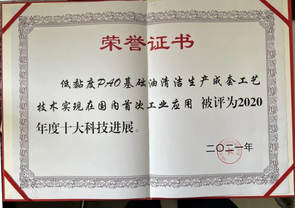 2021年12月,5000噸/年低粘度PAO基礎油工業試驗裝置的開車生產成功,低黏度PAO產品各項性能均達到國外同類產品技術水平,該項技術入選中國石油2021年十大科技進展。一年后,低粘度PAO基礎油生產裝置通過國家科技部組織驗收。
