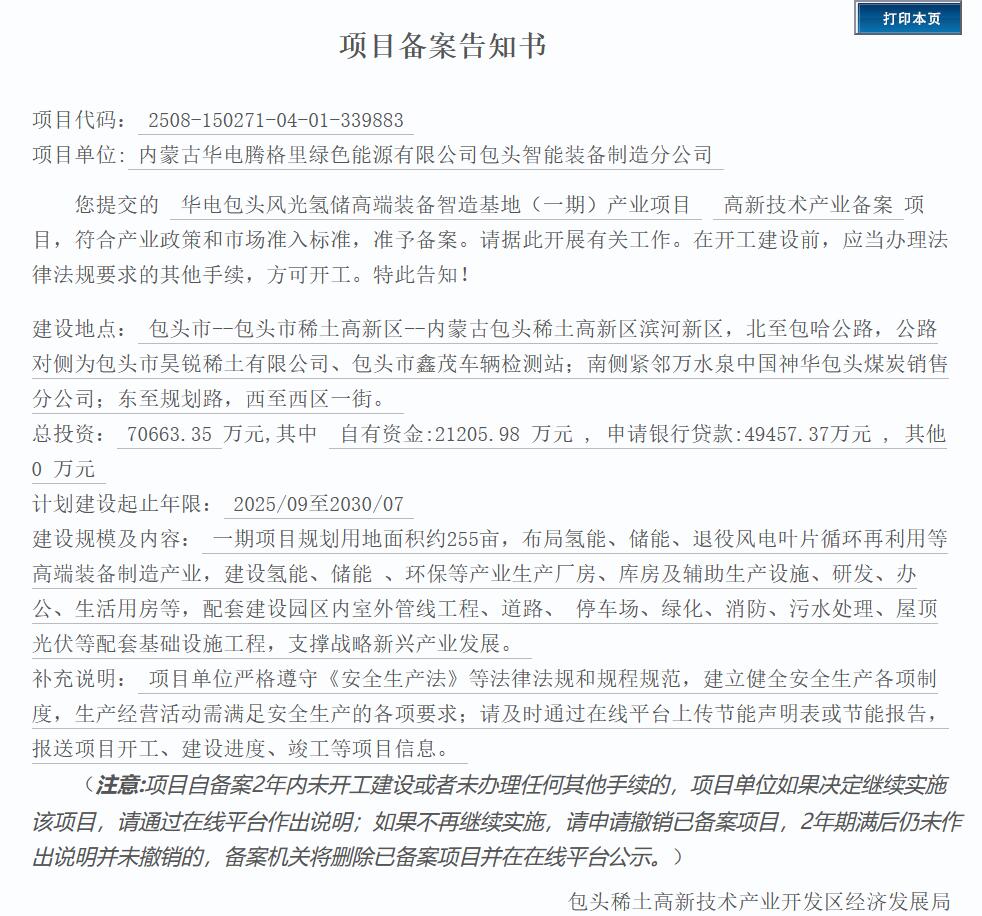 近日,內蒙古自治區投資項目在線審批大廳顯示,華電包頭風光氫儲高端裝備智造基地(一期)產業項目備案成功。