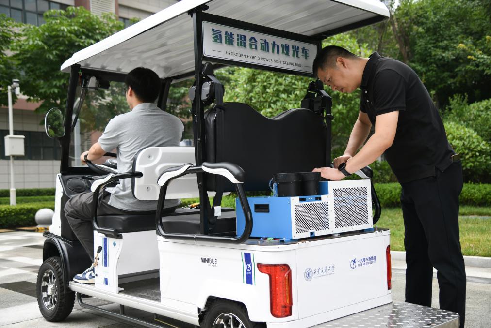 工作人員對氫能源觀光車進行運行調(diào)試。 新華社記者張博文 攝