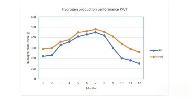 該系統結合了光伏發電與集熱功能,由PV/T板、DC/DC變換器和PEM電解槽組成。PV/T系統為電解槽提供電流并預熱進水。利用PEM電解槽(PEMEC)進行的年度測試數據對比了純PV系統與PV/T系統的月產氫量,表明PV/T系統因熱能利用具有優勢。