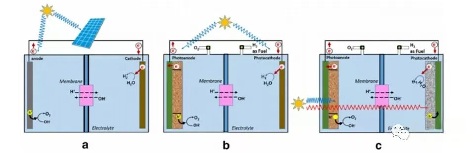 圖9:PEC電池的原理(a);光陽極帶金屬陰極(B);光電陰極帶金屬陽極(C)
