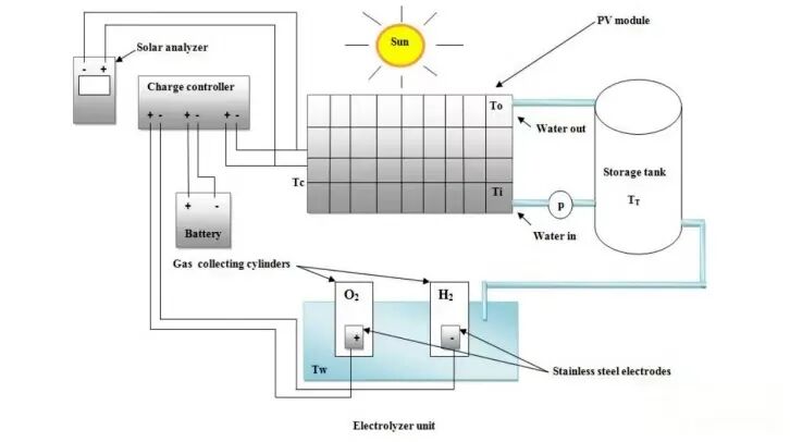 該系統利用光伏(PV)電池產生的電能驅動電解槽分解水。其核心原理如圖所示: