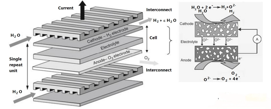 與低溫水電解相比,高溫(通常>700°C)蒸汽(H?O(g))電解(HTSE)所需電能更低,部分能量由熱能提供,從而降低成本和提升效率。核心部件是固體氧化物電解池(SOEC)(圖12),由致密電解質(氧離子導體)和兩側的多孔電極(H?側陰極,O?側陽極)組成陶瓷三層結構。