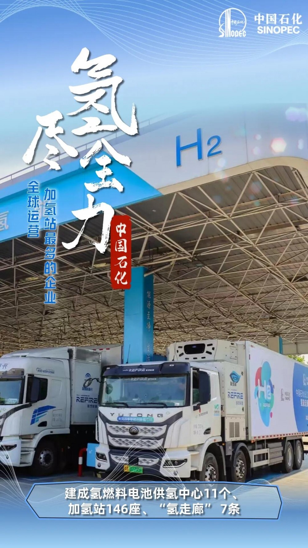 中國石化積極推動氫能交通發展,建成氫燃料電池供氫中心11個、加氫站146座 ,基本覆蓋“3+2”氫燃料電池示范城市群,成為全球運營加氫站最多的企業。