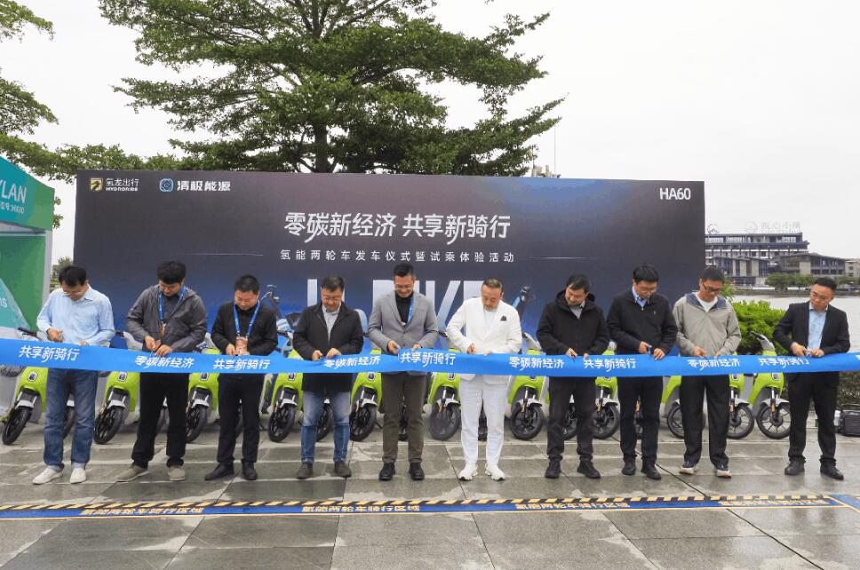 活動上,香港科創協會、香港生產力促進局、南國桃園、佛山環能院、粵港澳大灣區(廣東)創新創業孵化基地等領導以及重要合作伙伴一同為“零碳新經濟 共享新騎行”氫能兩輪車的批量發車儀式剪彩。