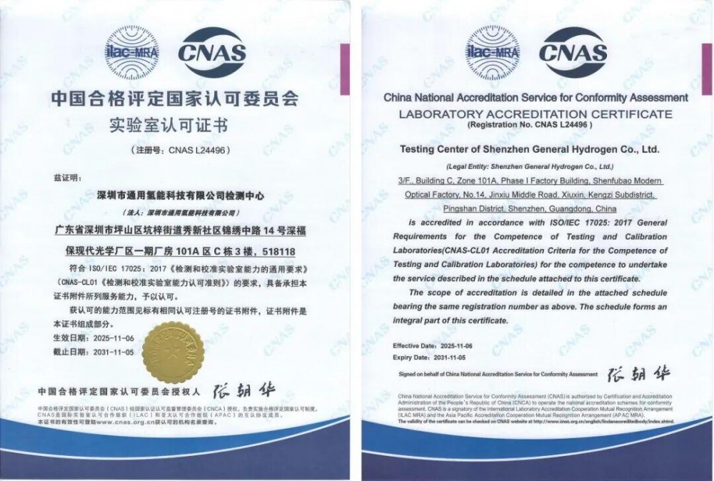 近日,華電科工股份有限公司旗下深圳市通用氫能科技有限公司收到中國合格評定國家認可委員會(CNAS)頒發的認可證書(注冊號:CNAS L24496),標志著通用氫能在檢測設施、技術能力、質量管理及人員專業水平等方面均已達到國際互認要求,躋身國家認可的權威檢測實驗室行列。