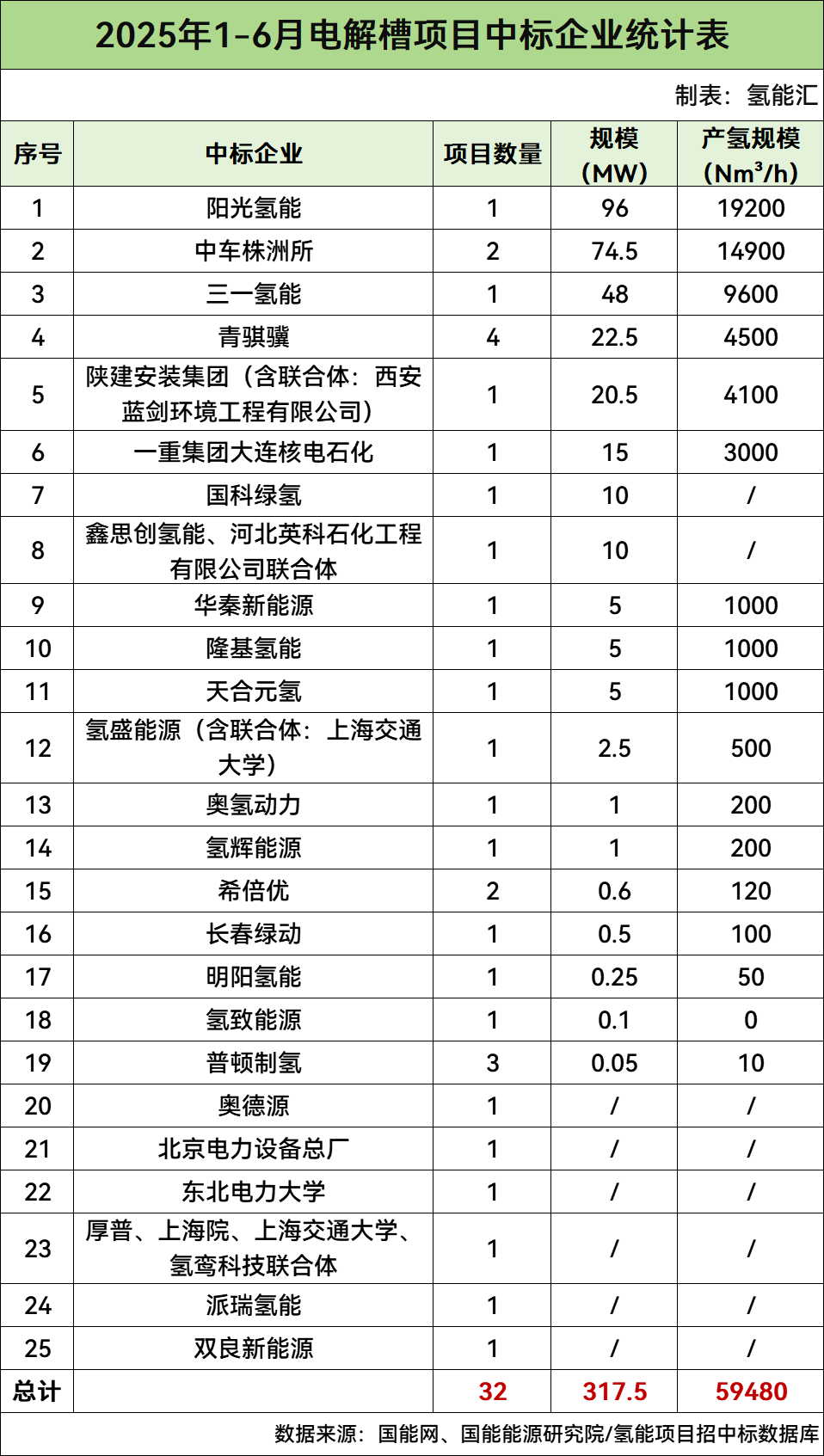 通過氫能項(xiàng)目數(shù)據(jù)庫(kù)分析發(fā)現(xiàn),2025年1-6月央國(guó)企及其他企業(yè)電解槽中標(biāo)項(xiàng)目累計(jì)32個(gè),規(guī)模累計(jì)317.5MW,產(chǎn)氫規(guī)模累計(jì)59480Nm3/h。