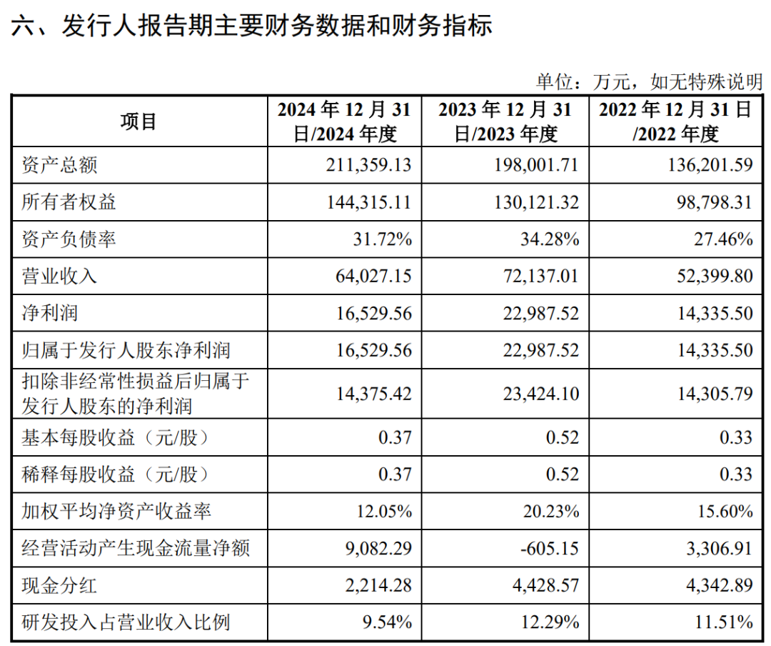 財(cái)務(wù)數(shù)據(jù)顯示,未來(lái)材料2022年、2023年、2024年的營(yíng)業(yè)收入分別為5.3億元、7.21億元、6.4億元,實(shí)現(xiàn)歸母凈利潤(rùn)分別為1.43億元、2.3億元、1.65億元。報(bào)告期各期,公司主營(yíng)業(yè)務(wù)毛利率分別為49.48%、55.79%和46.57%。