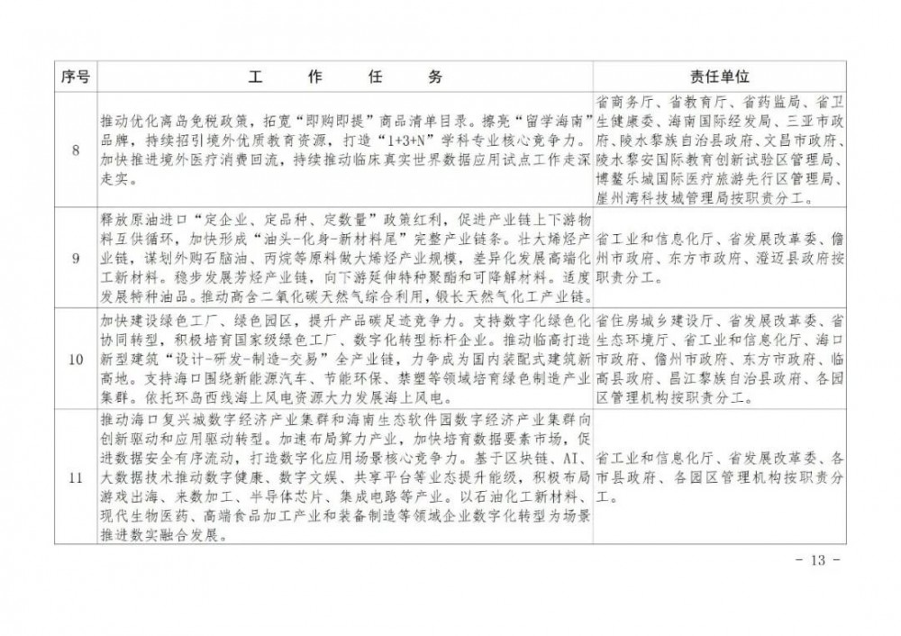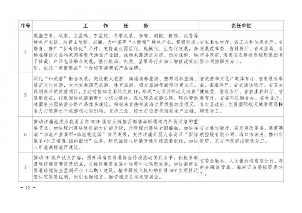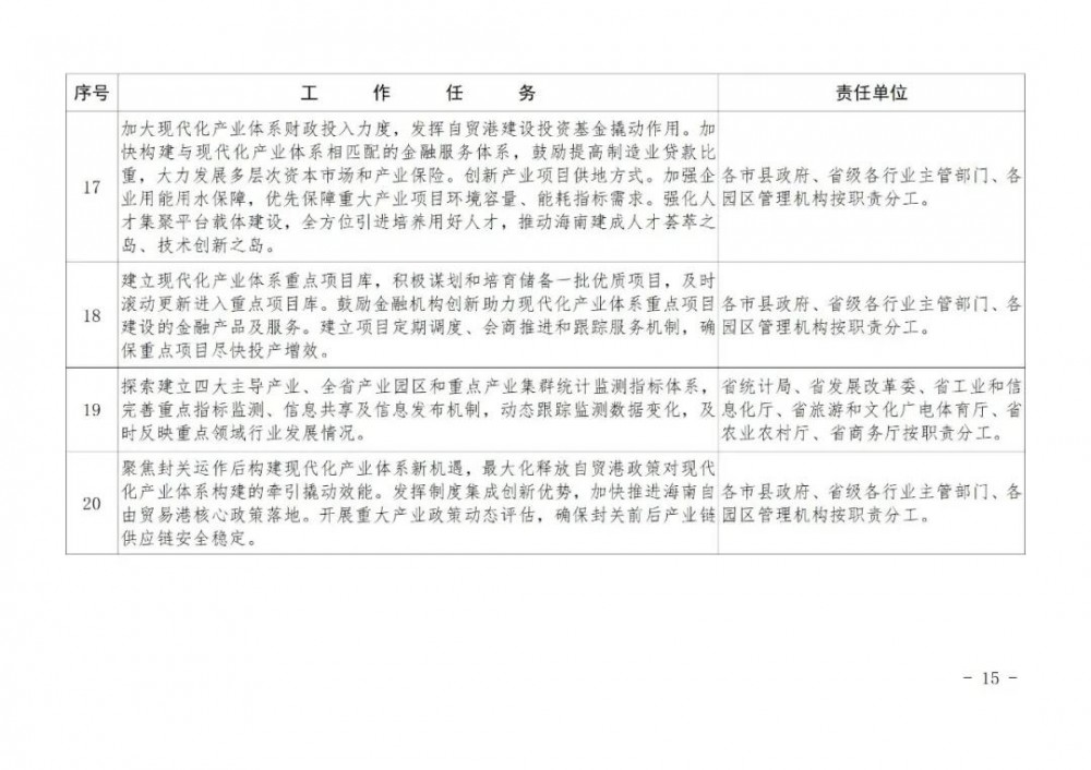 (二十)深化政策賦能。聚焦封關運作后構建現代化產業體系新機遇,最大化釋放自貿港政策對現代化產業體系構建的牽引撬動效能。發揮制度集成創新優勢,加快推進海南自由貿易港核心政策落地。開展重大產業政策動態評估,確保封關前后產業鏈供應鏈安全穩定。