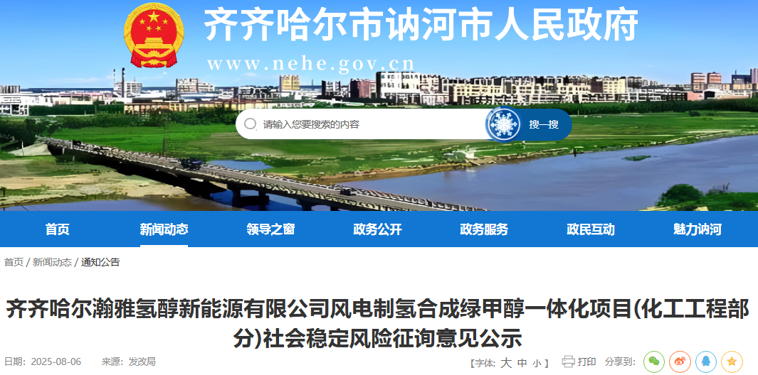 8月6日,齊齊哈爾市訥河市人民政府發(fā)布《齊齊哈爾瀚雅氫醇新能源有限公司風(fēng)電制氫合成綠甲醇一體化項(xiàng)目(化工工程部分)社會穩(wěn)定風(fēng)險征詢意見公示》。