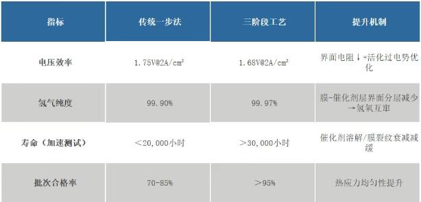 階梯降溫匹配材料收縮率→ 減少膜與催化劑層間的剪切應力,防止分層(電解槽高壓差下分層風險>燃料電池)。