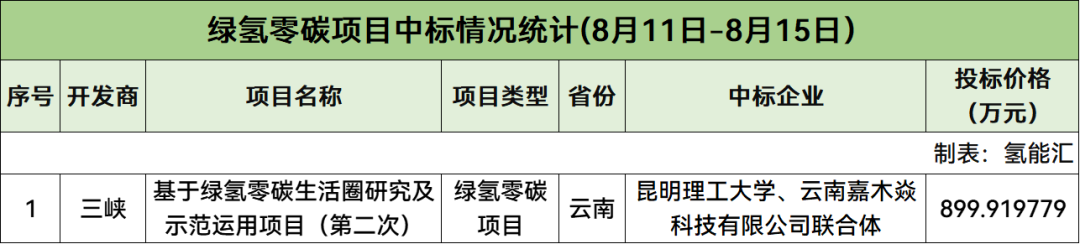 綠氫零碳項目有1個,開發(fā)商是三峽,中標企業(yè)為昆明理工大學(xué)、云南嘉木焱科技有限公司聯(lián)合體。
