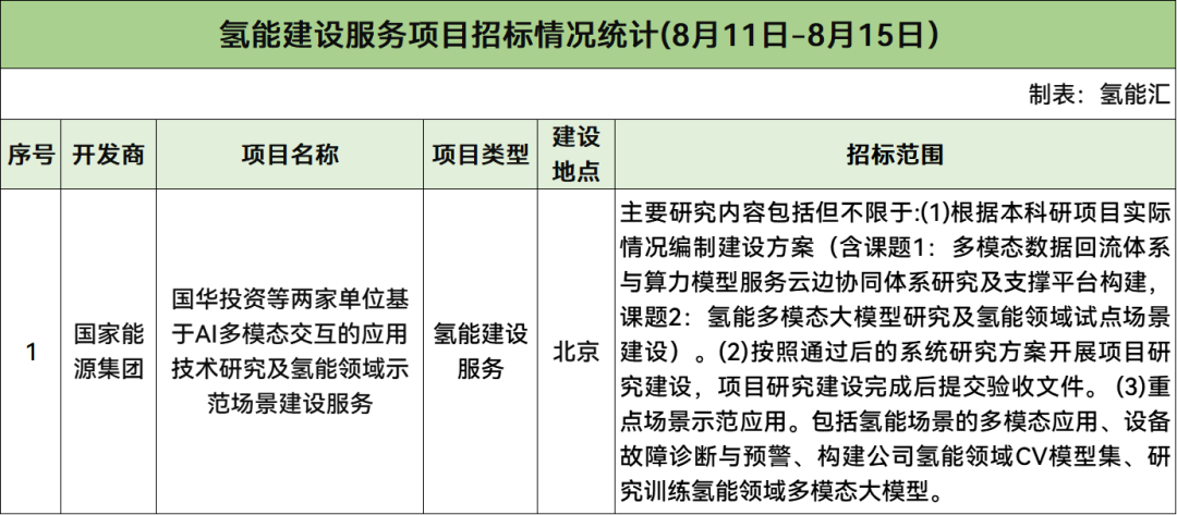 據(jù)統(tǒng)計,本周共1個氫能建設(shè)服務(wù)項目招標,項目為國華投資等兩家單位基于AI多模態(tài)交互的應(yīng)用技術(shù)研究及氫能領(lǐng)域示范場景建設(shè)服務(wù),招標人為國家能源集團。