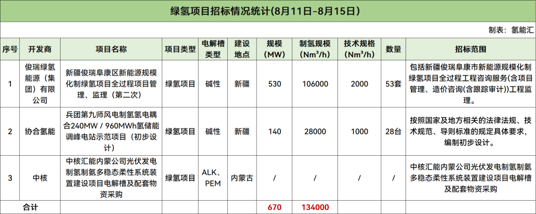 據(jù)統(tǒng)計,8月11日-8月15日氫能項目招投標方面,累計中標項目有6個,規(guī)模總計15MW,制氫規(guī)模總計3000Nm3/h。招標項目有7個,規(guī)模總計670MW,制氫規(guī)模總計134000Nm3/h。