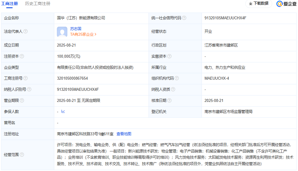 國華(江蘇)新能源有限公司成立于2025年08月21日,注冊資本100000萬元,注冊地位于南京市建鄴區科技路33號1幢611室,法定代表人為蘇志國。經營范圍包括:發電業務、輸電業務、供(配)電業務;燃氣經營;燃氣汽車加氣經營;新興能源技術研發;風力發電技術服務;太陽能發電技術服務;資源再生利用技術研發等。