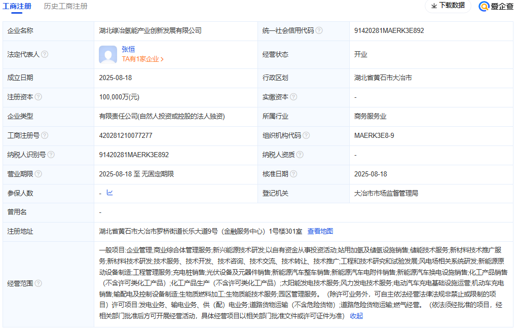 湖北綠冶氫能產業創新發展有限公司成立于2025年08月18日,注冊資本100000萬元,注冊地位于湖北省黃石市大冶市羅橋街道長樂大道9號(金融服務中心)1號樓301室,法定代表人為張恒。經營范圍包括一般項目:新興能源技術研發;站用加氫及儲氫設施銷售;儲能技術服務;風電場相關系統研發;新能源原動設備制造;充電樁銷售;光伏設備及元器件銷售;新能源汽車整車銷售;新能源汽車電附件銷售;新能源汽車換電設施銷售;太陽能發電技術服務;風力發電技術服務;電動汽車充電基礎設施運營等。