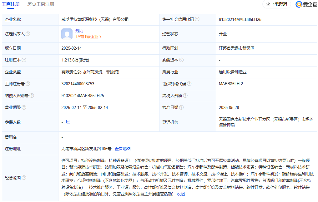 威孚伊特氫能源科技(無錫)有限公司成立于2025年02月14日,注冊資本:1213.6萬歐元,注冊地位于無錫市新吳區新友北路106號,法定代表人為魏力。經營范圍包括:新興能源技術研發;站用加氫及儲氫設施銷售;機械電氣設備銷售;汽車零部件及配件制造;儲能技術服務;新材料技術研發;汽車零部件研發;碳纖維再生利用技術研發等。
