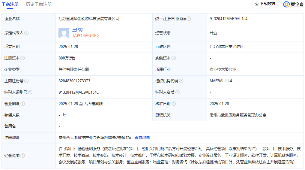 江蘇氫灣華創能源科技發展有限公司成立于2025年01月26日,注冊資本800萬元,注冊地位于常州西太湖科技產業園長塘路88號2號樓1樓,法定代表人為王銘東。經營范圍包括許可項目:技術服務、技術開發、技術咨詢、技術交流、技術轉讓、技術推廣;工程和技術研究和試驗發展;專業設計服務;工業設計服務;軟件開發;計算機系統服務;會議及展覽服務;項目策劃與公關服務;創業空間服務;物業管理;財務咨詢等。