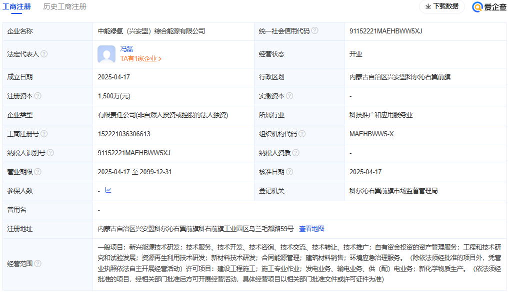 中能綠氫(興安盟)綜合能源有限公司成立于2025年04月17日,注冊資本1500萬元,注冊地位于內蒙古自治區興安盟科爾沁右翼前旗科右前旗工業園區烏蘭毛都路59號,法定代表人為馮磊。經營范圍包括:新興能源技術研發;技術服務、技術開發、技術咨詢、技術交流、技術轉讓、技術推廣;工程和技術研究和試驗發展;資源再生利用技術研發;新材料技術研發;合同能源管理;發電業務、輸電業務、供(配)電業務等。