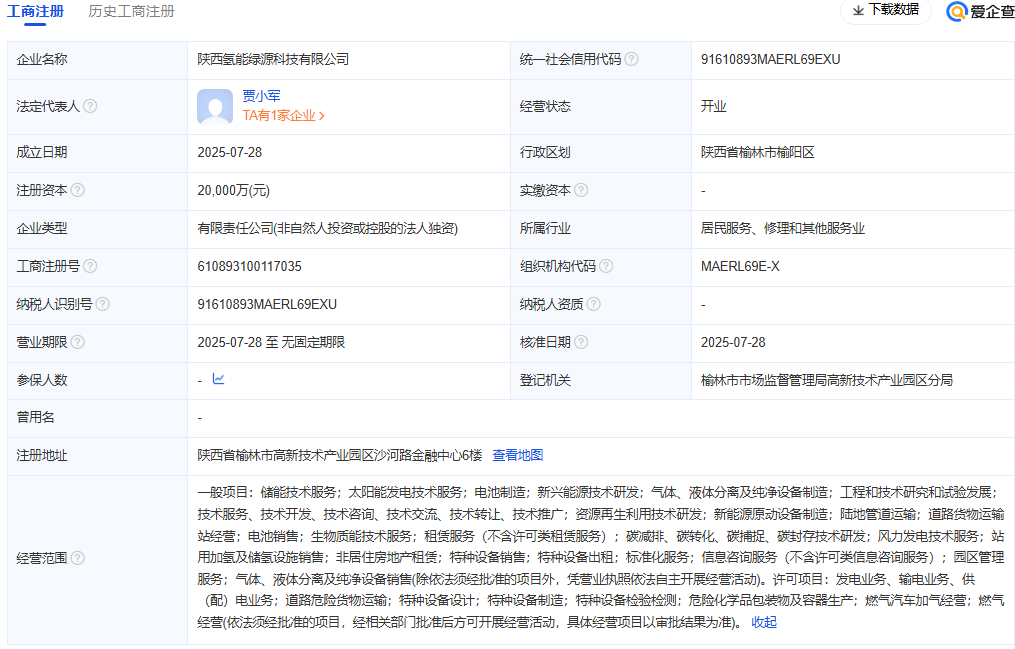 陜西氫能綠源科技有限公司成立于2025年07月28日,注冊資本20000萬元,注冊地位于陜西省榆林市高新技術產業園區沙河路金融中心6樓,法定代表人為賈小軍。經營范圍包括一般項目:儲能技術服務;太陽能發電技術服務;電池制造;新興能源技術研發;新能源原動設備制造;陸地管道運輸;碳減排、碳轉化、碳捕捉、碳封存技術研發;風力發電技術服務;站用加氫及儲氫設施銷售等。