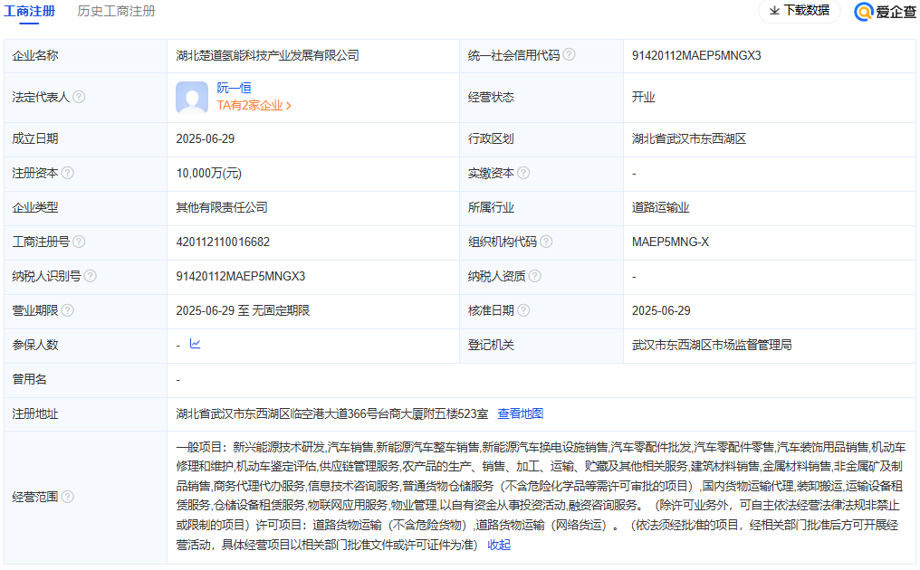 湖北楚道氫能科技產業發展有限公司成立于2025年06月29日,注冊資本10000萬元,注冊地位于湖北省武漢市東西湖區臨空港大道366號臺商大廈附五樓523室,法定代表人為阮一恒。經營范圍包括:新興能源技術研發,汽車銷售,新能源汽車整車銷售,新能源汽車換電設施銷售,汽車零配件批發,汽車零配件零售,汽車裝飾用品銷售,機動車修理和維護,機動車鑒定評估,供應鏈管理服務。