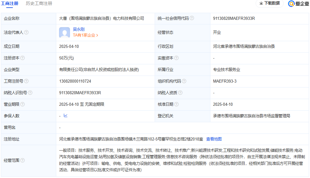 大唐(圍場滿族蒙古族自治縣)電力科技有限公司成立于2025年04月10日,注冊資本50萬元,注冊地位于河北省承德市圍場滿族蒙古族自治縣圍場鎮木蘭南路102-5號塞罕壩生態館2樓2018室,法定代表人為吳永剛。經營范圍包括:新興能源技術研發;工程和技術研究和試驗發展;儲能技術服務;電動汽車充電基礎設施運營;站用加氫及儲氫設施銷售;輸電、供電、受電電力設施的安裝、維修和試驗等。