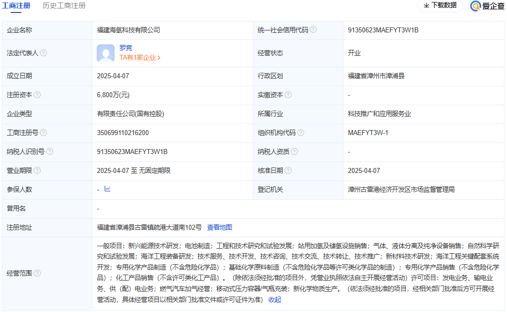福建海氫科技有限公司成立于2025年04月07日,注冊資本6800萬元,注冊地位于福建省漳浦縣古雷鎮疏港大道南102號,法定代表人為羅競。經營范圍包括:新興能源技術研發;站用加氫及儲氫設施銷售;氣體、液體分離及純凈設備銷售;新材料技術研發;海洋工程關鍵配套系統開發;發電業務、輸電業務、供(配)電業務;燃氣汽車加氣經營;移動式壓力容器/氣瓶充裝;新化學物質生產等。