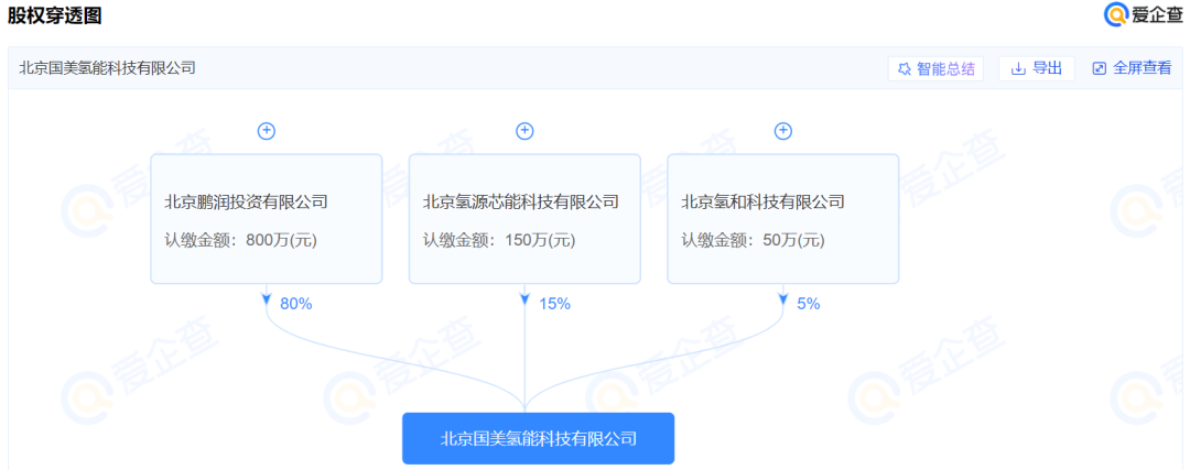 股權(quán)穿透圖顯示,北京國(guó)美氫能科技有限公司由黃光裕(即黃俊烈)控股北京鵬潤(rùn)投資有限公司、北京氫源芯能科技有限公司、北京氫和科技有限公司共同出資組建,持股比例分別為80%、15%、5%。