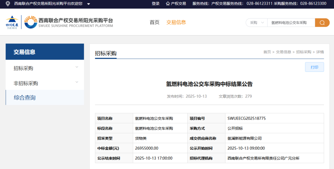 10月13日,西南聯(lián)合產(chǎn)權(quán)交易所發(fā)布?xì)淙剂想姵毓卉嚥少徶袠?biāo)結(jié)果公告。中標(biāo)人為氫瀾新能源有限公司,中標(biāo)金額為 26,955,000.00元