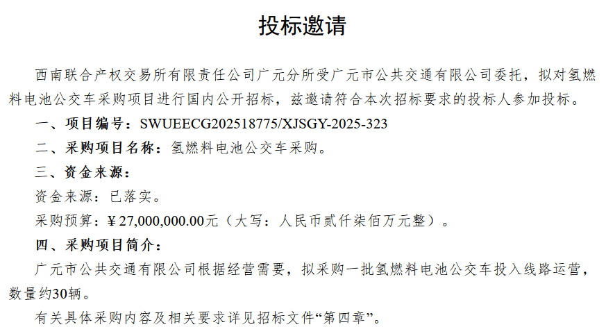 此前招標(biāo)公告顯示,廣元市公共交通有限公司根據(jù)經(jīng)營需要,擬采購一批氫燃料電池公交車投入線路運(yùn)營,數(shù)量約30輛,預(yù)算2700萬元。