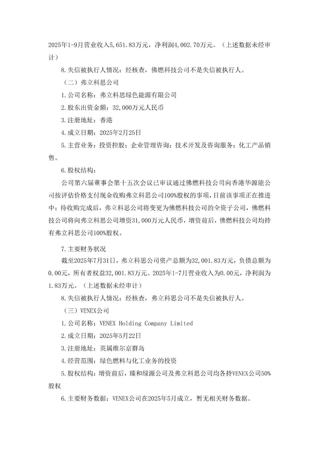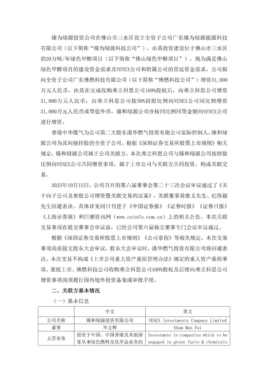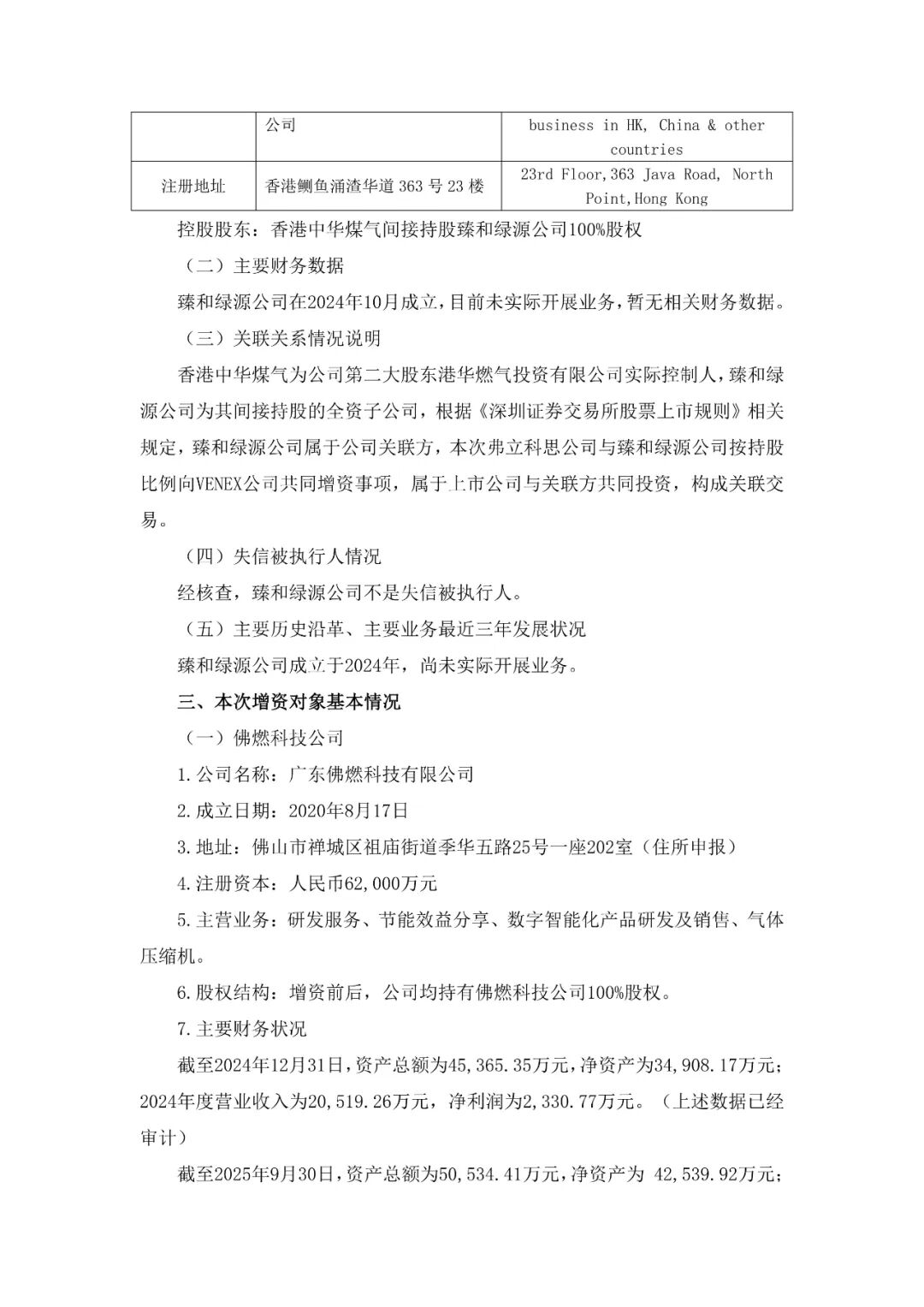 為進一步落實雙方合作,佛燃能源全資子公司香港華源能國際能源貿易有限公司(簡稱“香港華源能公司”)設立全資子公司弗立科思綠色能源有限公司(簡稱“弗立科思公司”),并由其與香港中華煤氣下屬子公司臻和綠源投資有限公司(簡稱“臻和綠源公司”)分別出資50%,在英屬維爾京群島(The British Virgin Islands)合資設立VENEX Holding Company Limited(簡稱“VENEX公司”),VENEX公司不納入雙方的合并報表范圍。