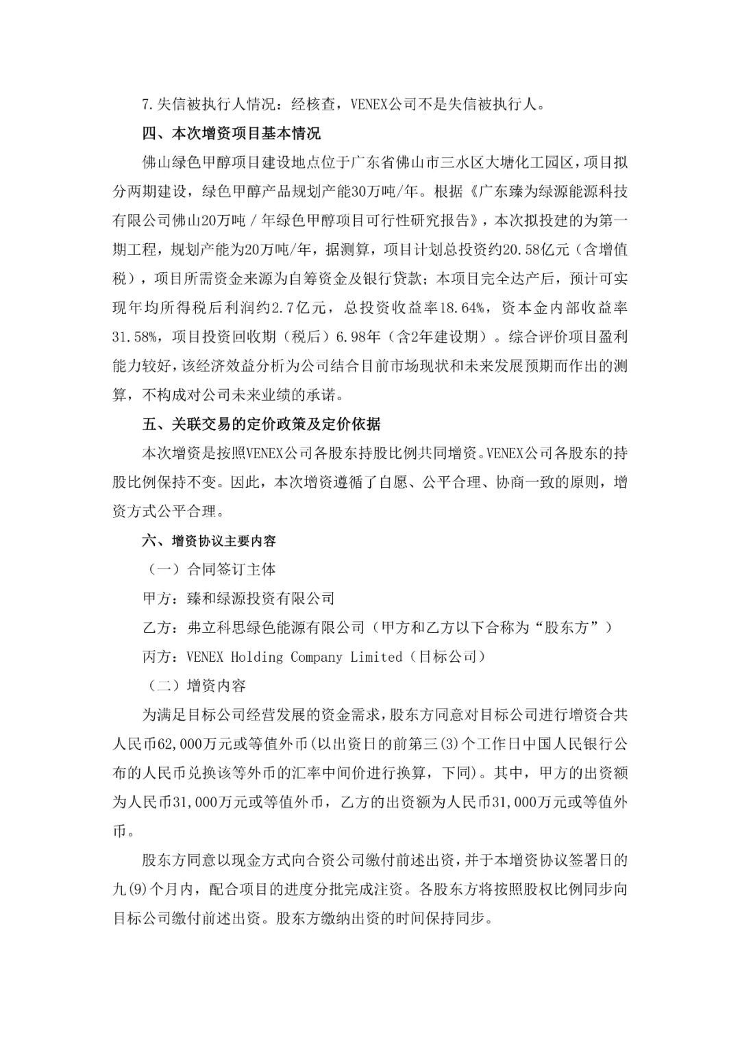 VENEX公司成立后在佛山市三水區投資設立了廣東臻為綠源投資有限公司(簡稱“臻為綠源投資公司”)并由其通過收購及自建的方式從事中國境內綠色燃料及化工項目的投資開發及生產經營;臻為綠源投資公司收購的內蒙古易高煤化科技有限公司(簡稱“內蒙古易高公司”)100%股權已完成工商變更登記,內蒙古易高公司已實現5萬噸/年綠色甲醇產能并批量銷售,后續將投入資金對現有甲醇生產線進行改造,最終形成30萬噸/年綠色甲醇產能。