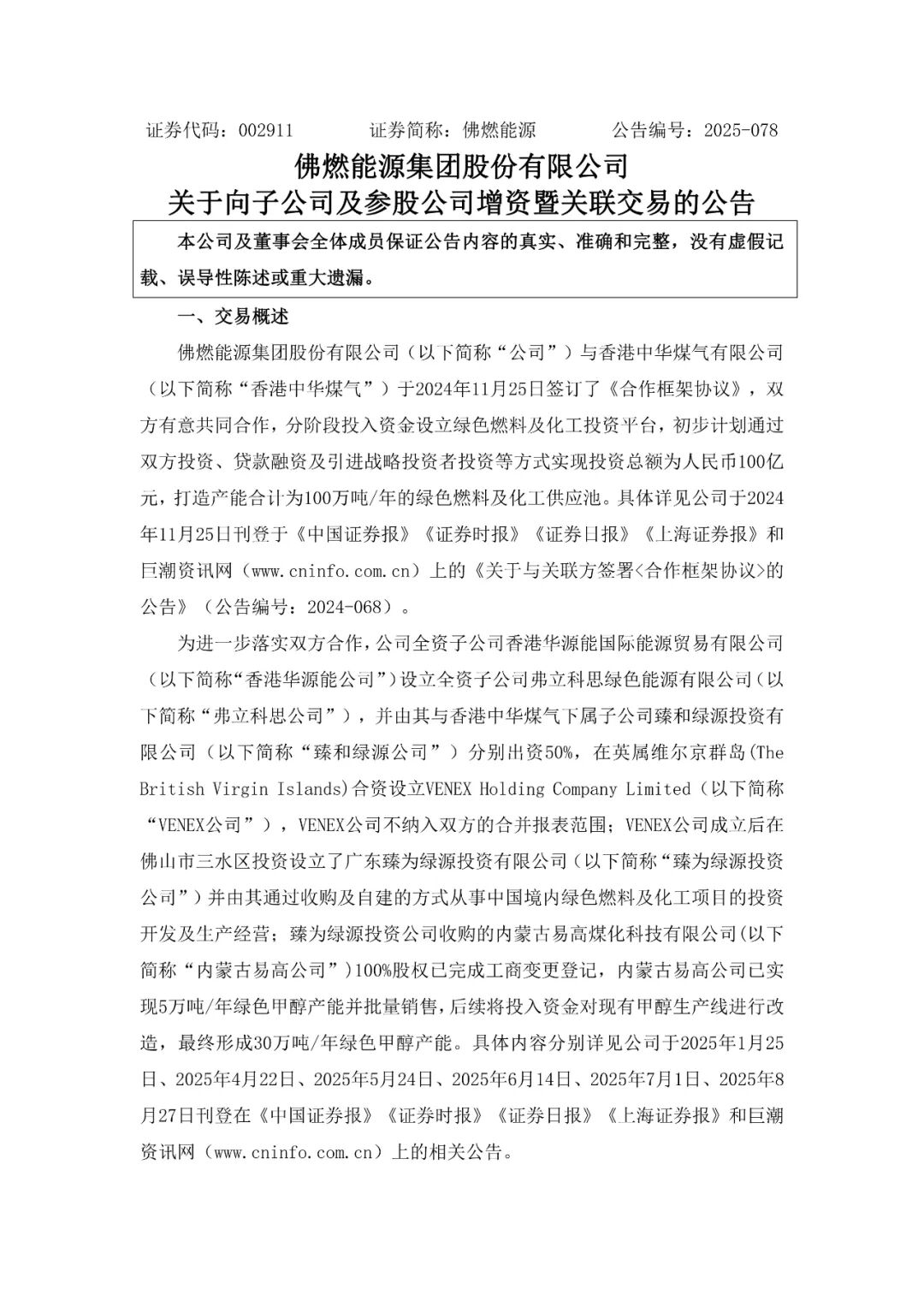 10月16日,佛燃能源集團股份有限公司(簡稱:佛燃能源)發布關于向子公司及參股公司增資暨關聯交易的公告。