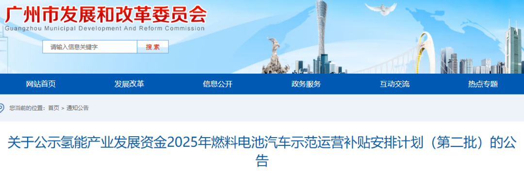 近日,廣州市發展和改革委員會發布《關于公示氫能產業發展資金2025年燃料電池汽車示范運營補貼安排計劃(第二批)的公告》。