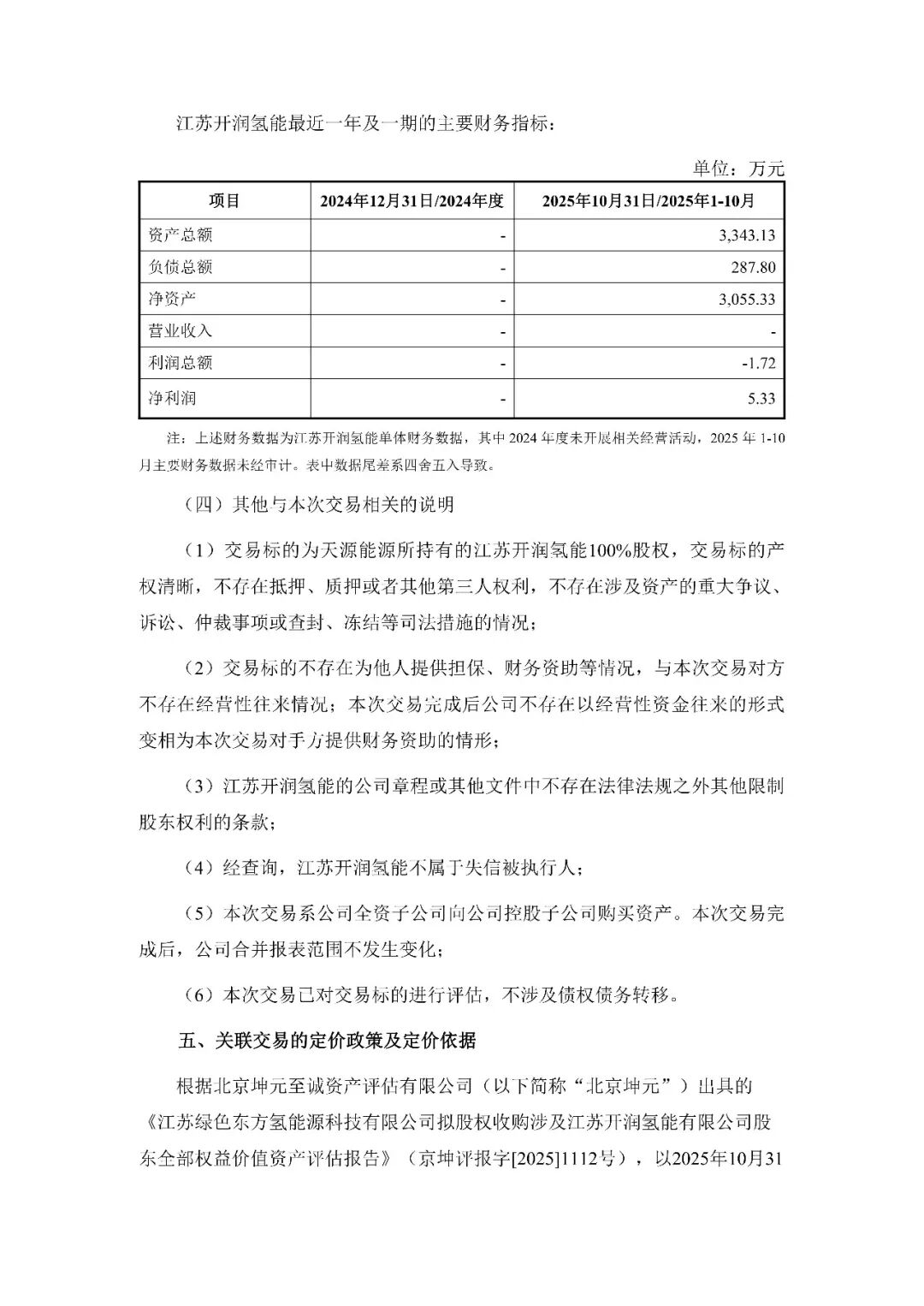 公告稱,武漢天源全資子公司江蘇綠色東方氫能源科技有限公司(簡稱“江蘇氫能科技”)擬以3,049.49萬元的對價收購公司控股子公司武漢天源能源有限公司(簡稱“天源能源”)持有的江蘇開潤氫能有限公司(簡稱“江蘇開潤氫能”)100%股權(簡稱“本次交易”)。