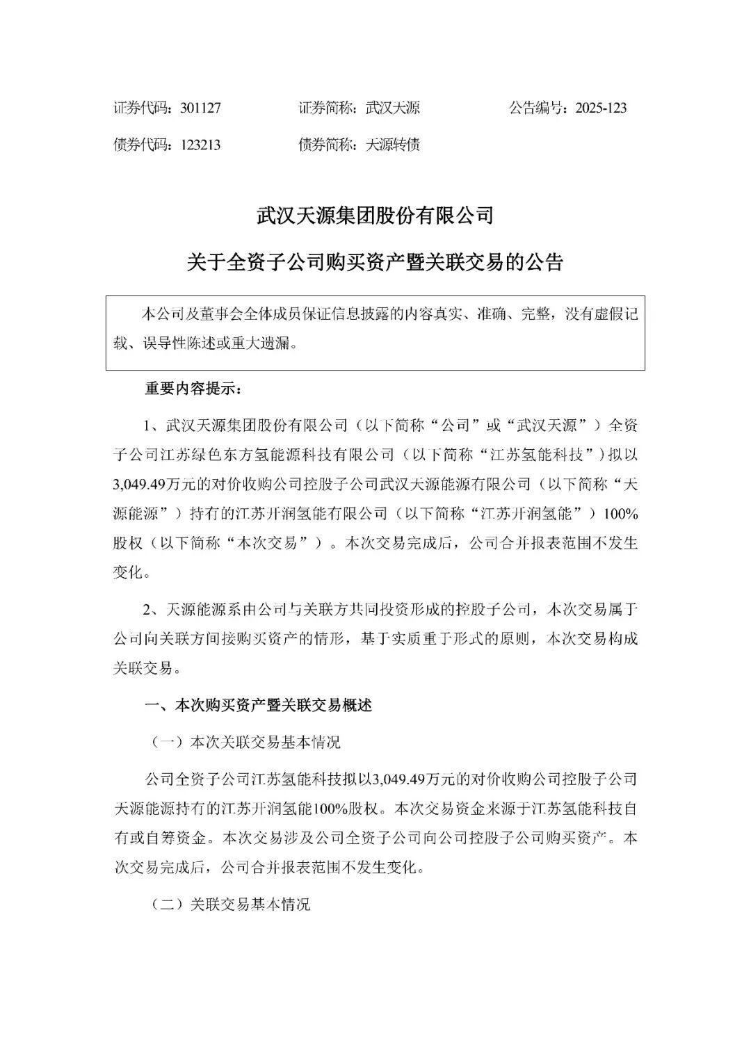 12月19日,武漢天源集團股份有限公司(簡稱:武漢天源 )發布關于全資子公司購買資產暨關聯交易的公告。