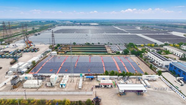 走進水電解制加氫一體化項目,6萬余塊光伏板在600畝水面連綿鋪展,水電解制氫裝置在陽光下運行。這里以中水(綠水)為源,光伏綠電為能,通過電解水制備“綠氫”,實現新水“零使用”、廢水與二氧化碳“零排放”。