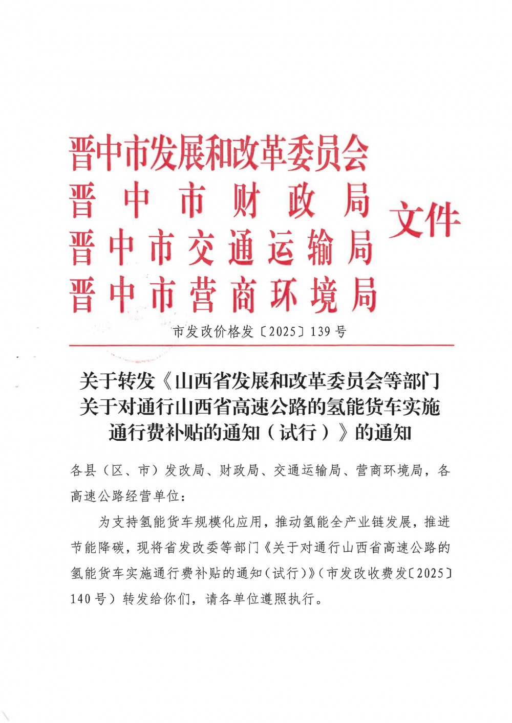 近日,晉中市發展和改革委員會發布關于轉發《山西省發展和改革委員會等部門關于對通行山西省高速公路的氫能貨車實施通行費補貼的通知(試行)》的通知。