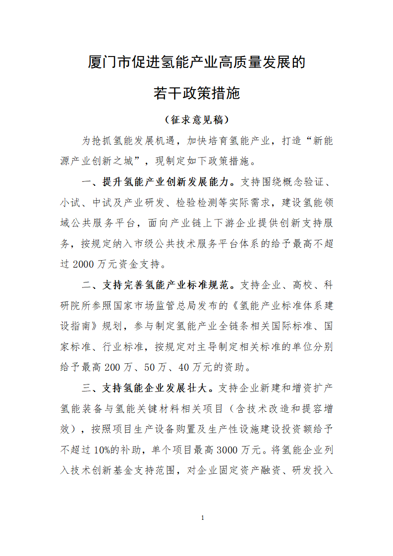 1. 廈門市促進氫能產業高質量發展若干政策措施(征求意見稿)