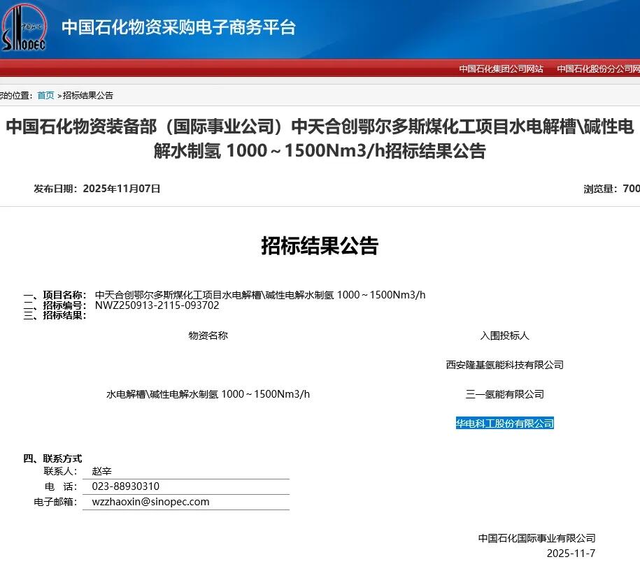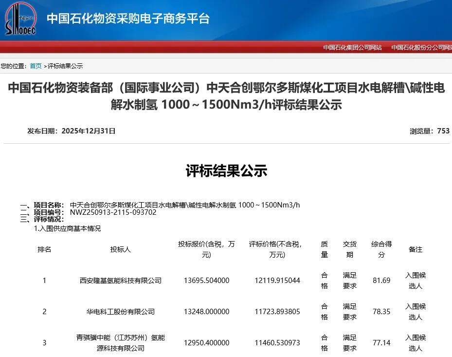 值得注意的是,2025年11月7日,中天合創鄂爾多斯煤化工項目水電解槽堿性電解水制氫 1000~1500Nm3/h公布過一次招標結果公告,公告顯示,入圍投標人分別是西安隆基氫能科技有限公司、三一氫能有限公司、華電科工股份有限公司。此次,評標結果,企業進行了變更。