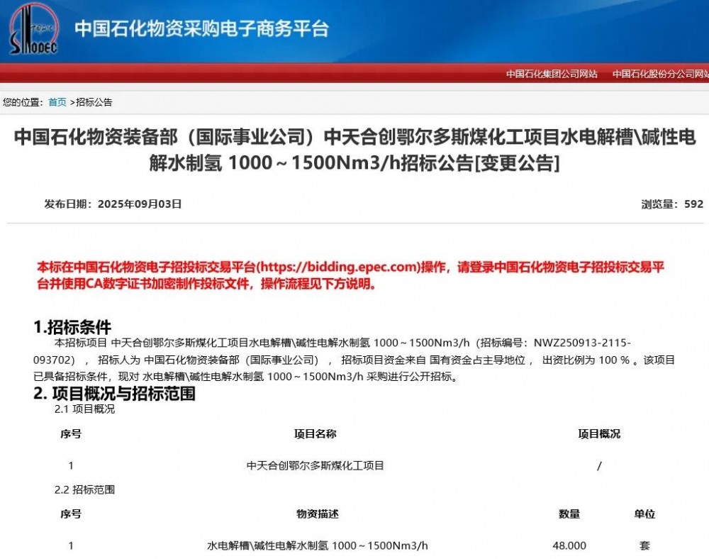 近日,中國石化物資裝備部(國際事業公司)中天合創鄂爾多斯煤化工項目水電解槽堿性電解水制氫1000~1500Nm3/h評標結果公示。
